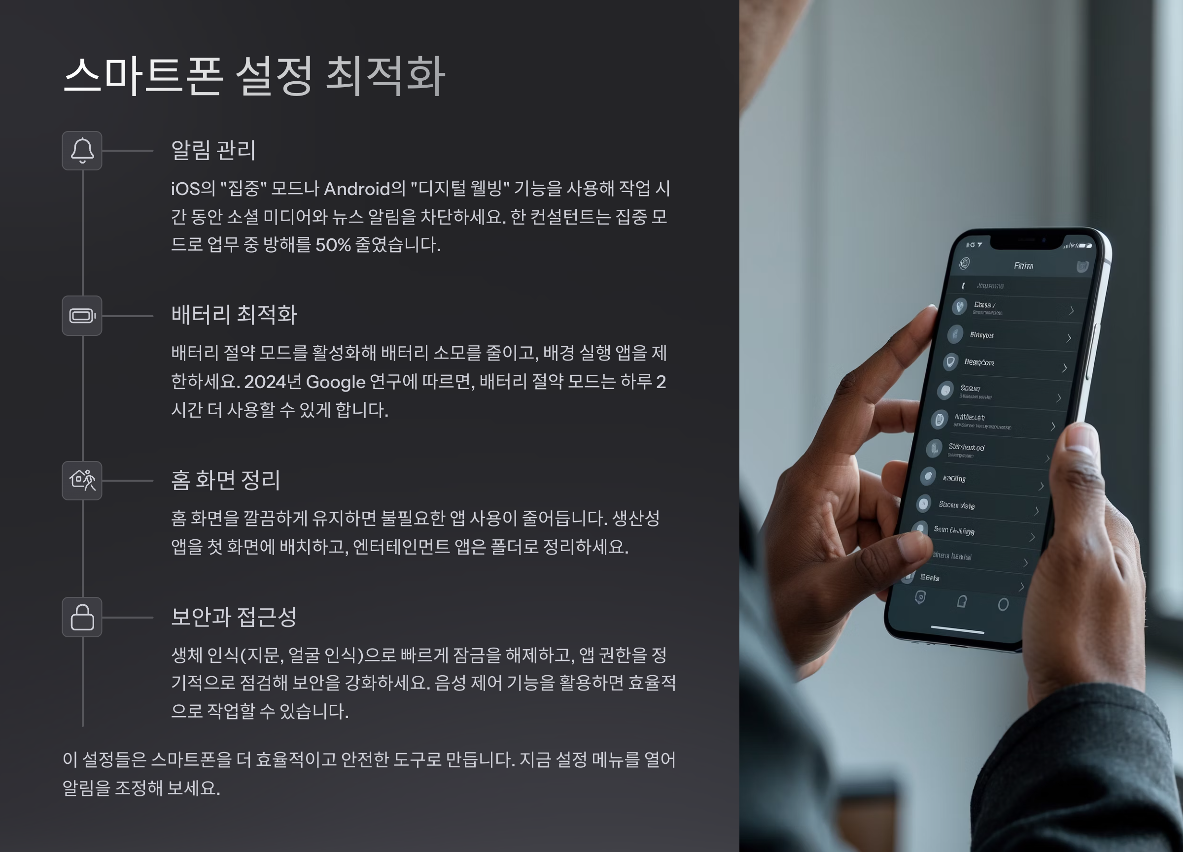 앱뿐만 아니라 스마트폰 설정도 생산성에 큰 영향을 미칩니다. 알림 관리와 배터리 최적화로 방해 요소를 줄이고 효율성을 높여 보세요.