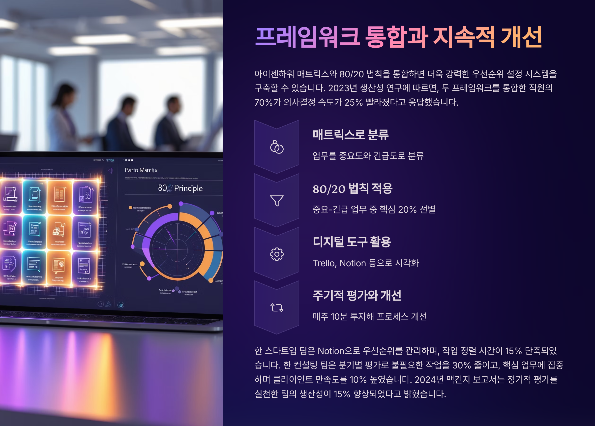 아이젠하워 매트릭스와 80/20 법칙을 통합하면 더욱 강력한 우선순위 설정 시스템을 구축할 수 있습니다. 첫 번째로, 아이젠하워 매트릭스로 업무를 분류한 뒤, 80/20 법칙을 적용해 중요하고 긴급한 업무 중에서도 가장 큰 영향을 미치는 20%를 선별하세요. 예를 들어, 프로젝트 매니저는 마감일이 임박한 보고서(중요-긴급) 중 고객 피드백 반영 작업(20%)에 집중하며, 프로젝트 성공률을 20% 높였습니다. 2023년 생산성 연구에 따르면, 두 프레임워크를 통합한 직원의 70%가 의사결정 속도가 25% 빨라졌다고 응답했습니다.
