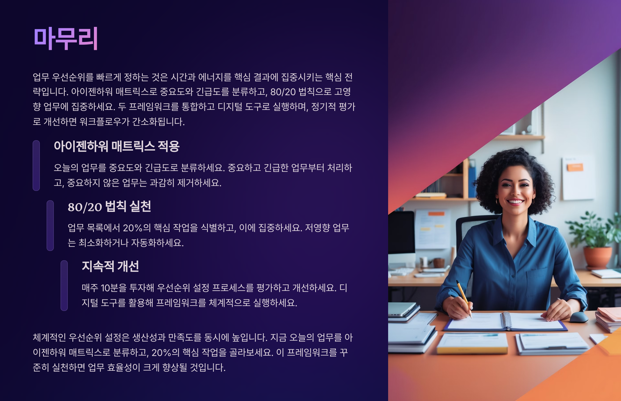 업무가 쌓여갈 때 무엇부터 시작해야 할지 망설인다면, 체계적인 우선순위 설정이 필요합니다. 이 글에서는 아이젠하워 매트릭스와 80/20 법칙 같은 의사결정 프레임워크를 활용해 업무 우선순위를 빠르게 정하는 방법을 소개합니다. 데이터와 사례를 통해 실용적인 팁을 제공하며, 최신 생산성 트렌드와 연결해 효율적인 워크플로우를 구축하는 인사이트를 안내합니다. 모든 연령대의 직장인, 프리랜서, 학생이 활용할 수 있는 이 전략으로 시간을 아끼고 중요한 결과에 집중해 보세요!